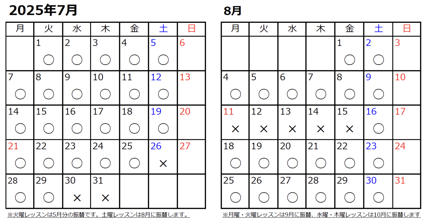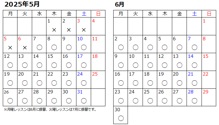 レッスンを開催している日時はカレンダーをチェックしてください。